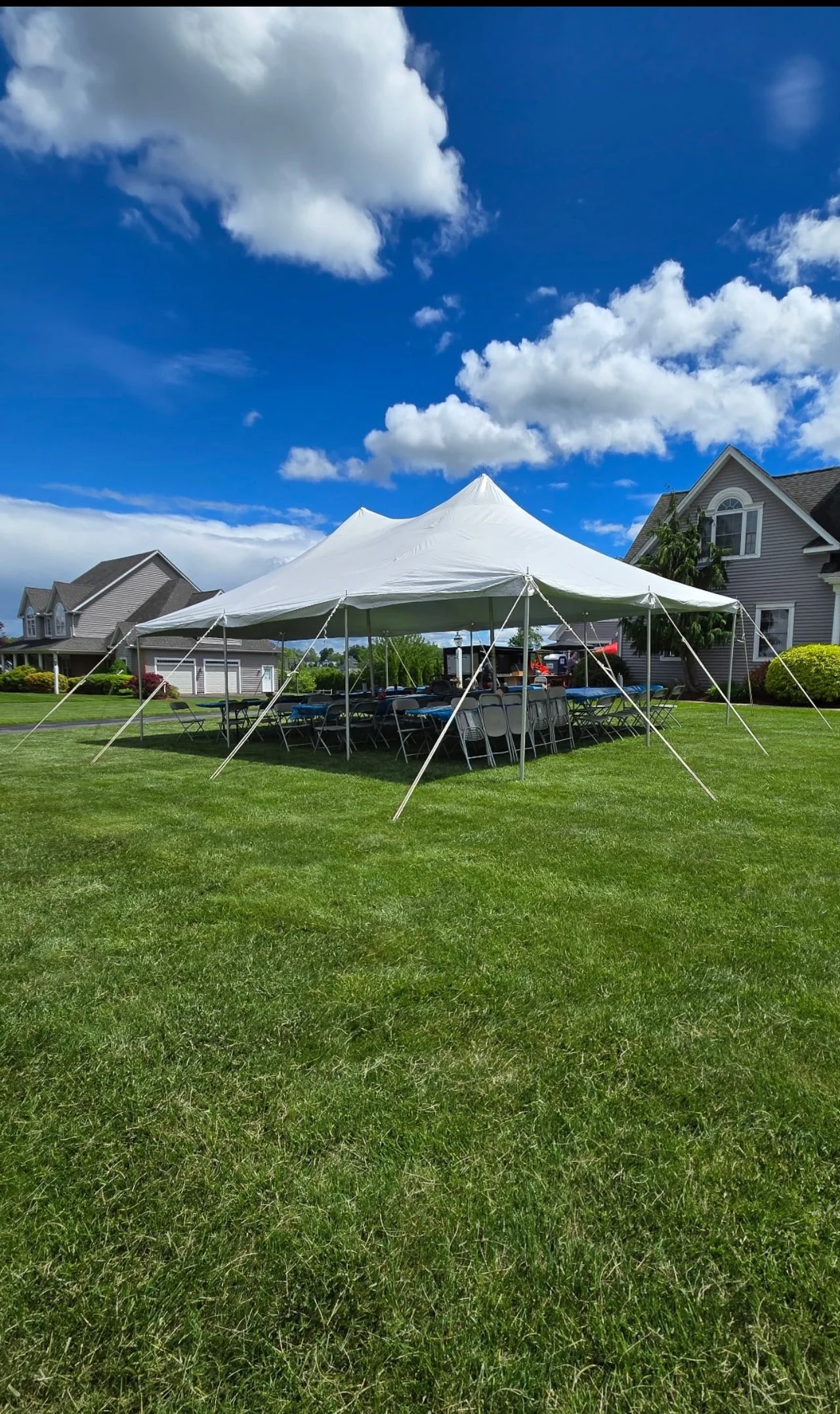 The 20’ x 20’ Pole tent is ideal for graduations, backyard parties, and more. It comfortably fits up to 40 guests seated.